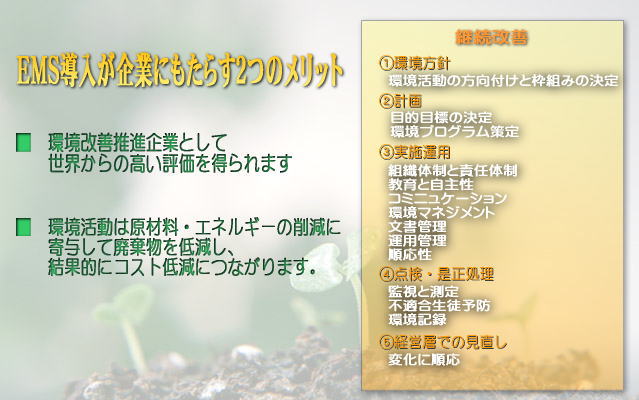 ISO14000シリーズ取得支援(審査 登録公表)を行い、環境保全のために環境方針・目的・目標を設定し、それを達成し、さらに継続的改善をはかっていくための環境マネジメントシステムEMSの国際規格がISO14001です。EMSを基本に活動を展開、廃棄物削減等によるコスト削減と、情報公開することで顧客に対するイメージ向上が期待できます。環境マネジメントマニュアルや手順書の作成までサポートします。